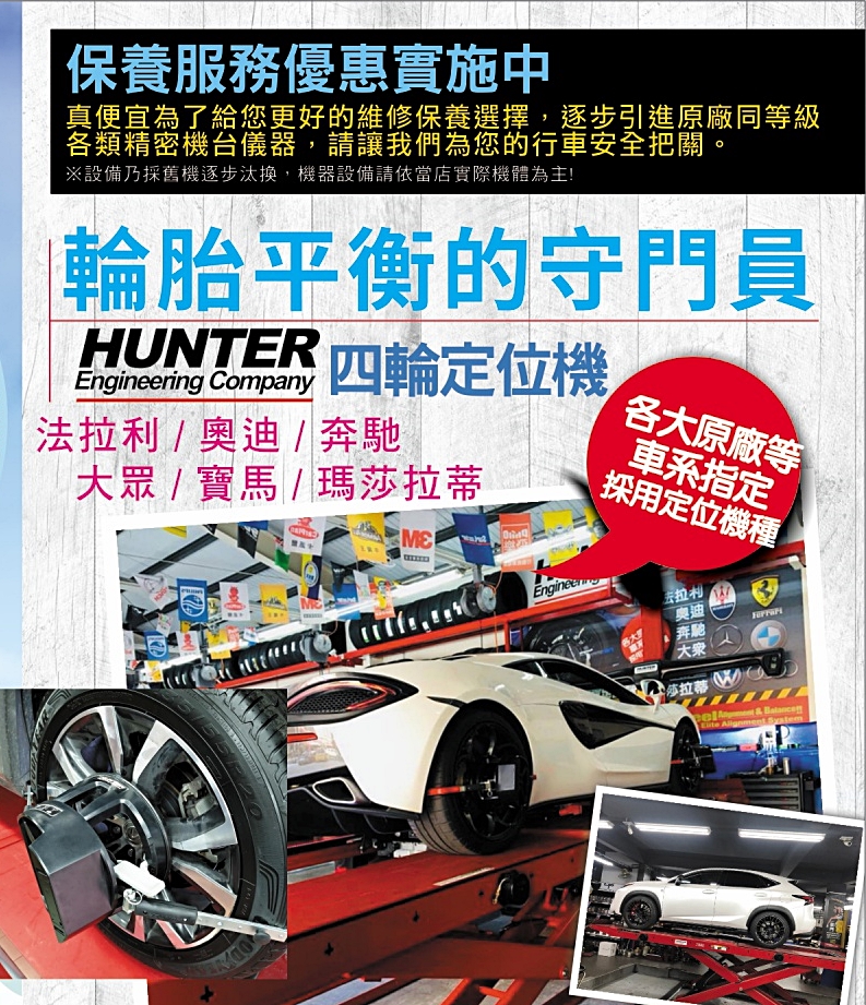 "真便宜汽車百貨各大型門市的四輪定位機,均不惜成本選購歐美超跑等級的(德國百世霸、美國HUNTER)四輪定位設備,使消費者能夠以一般國產車四輪定位的價格,享有歐美超跑車種等級的四輪定位價值。"
